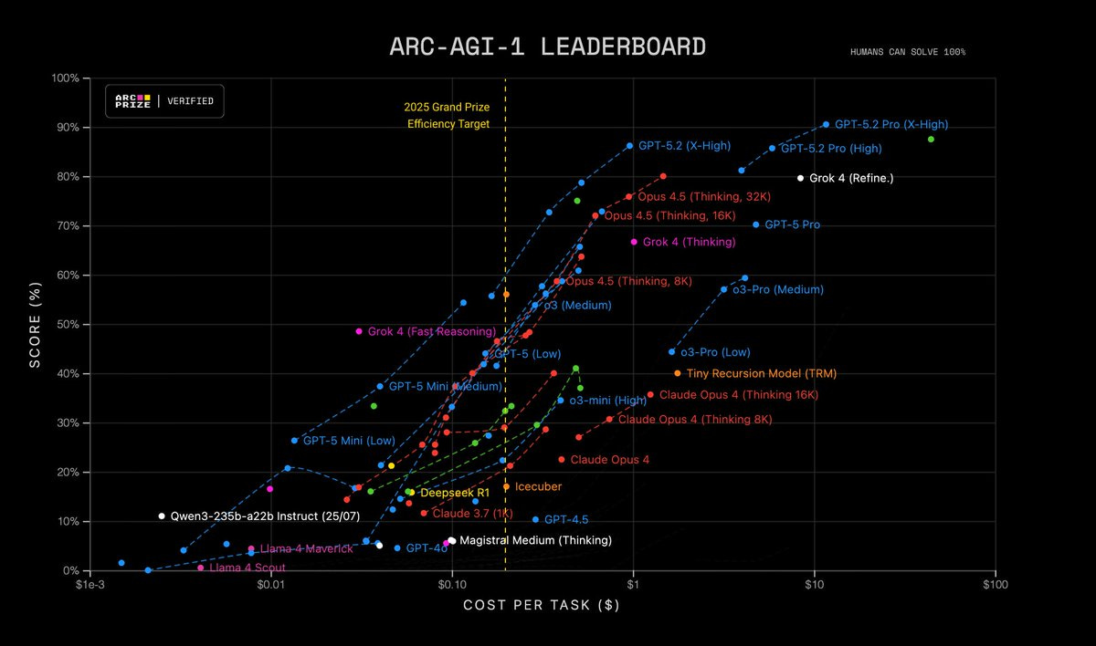 GPT-5.2 Pro (X-High) scores 90.5% on the ARC-AGI-1 eval, at $11.64/task. “A year ago, we verified a preview of an unreleased version of OpenAI o3 (High) that scored 88% on ARC-AGI-1 at est. $4.5k/task … This represents a ~390X efficiency improvement in one year” (@arcprize)