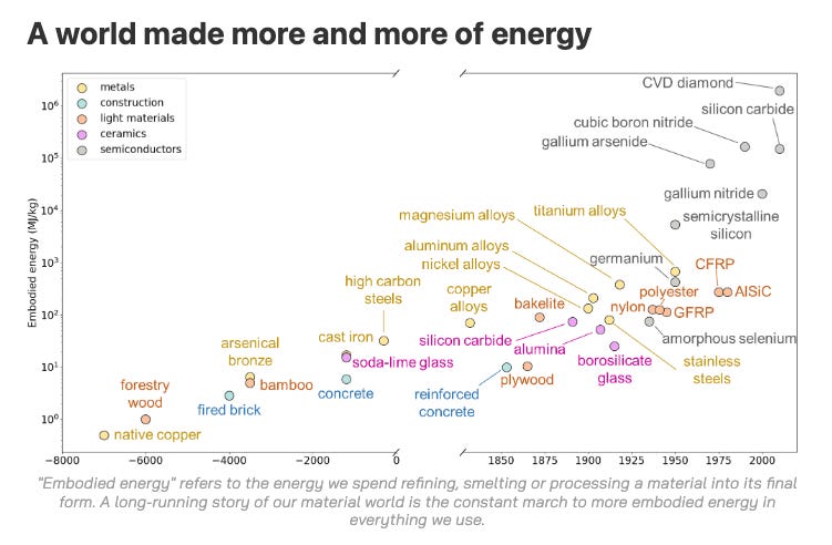 Energy not only extracts material resources, it also shapes them. “A long-running story of our material world,” writes Ian McKay, “is the constant march to more embodied energy in everything we use”: as we advanced from wood and copper, to bronze, to cast iron, to steel, to titanium, to semiconductors, the energy used per kilogram to process our materials has increased by several orders of magnitude.46 By using more energy, we’re able to make lighter and tougher materials and to tap more abundant resources. It stands to reason that the materials of the future will continue this trend.
