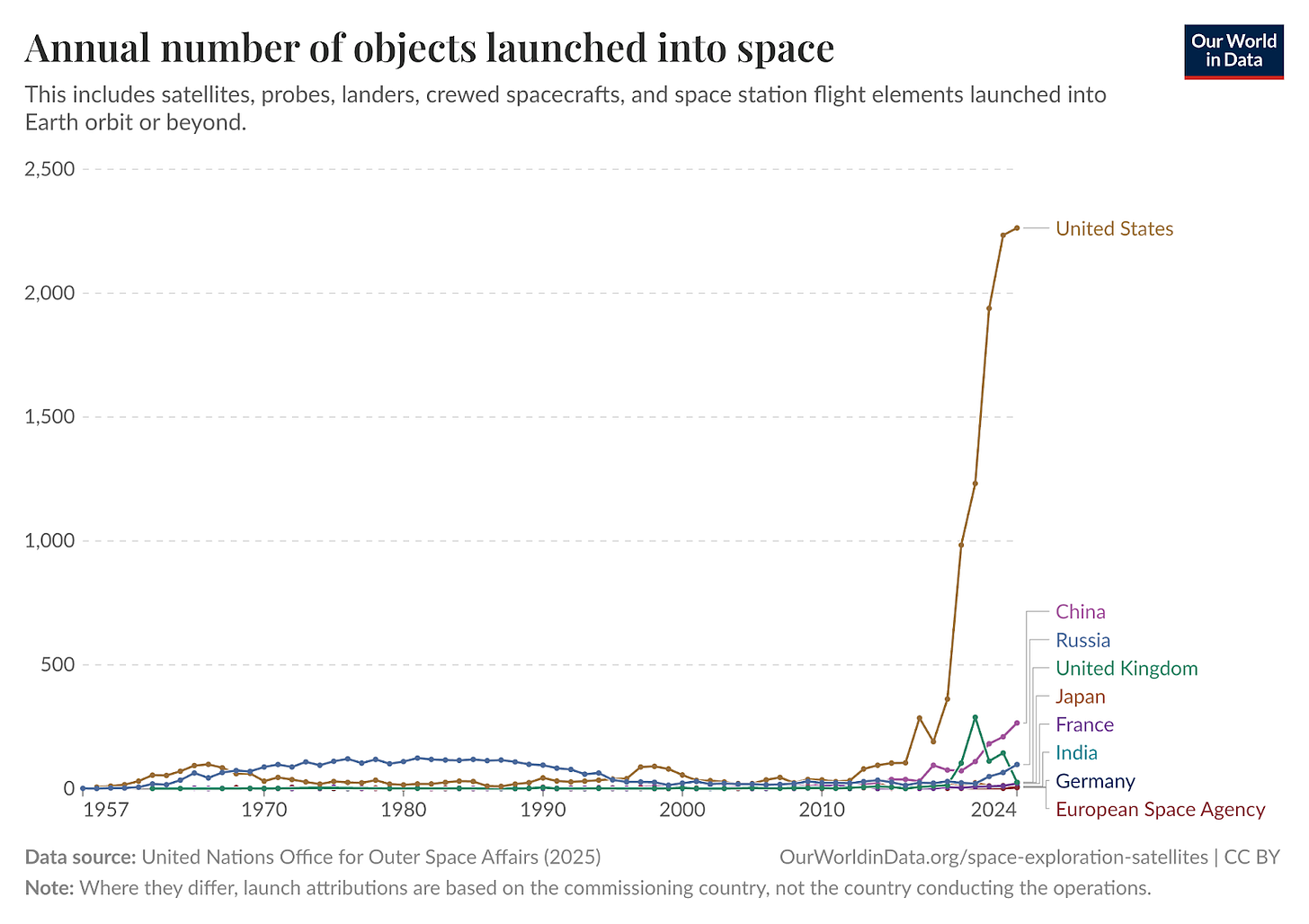 Rocketry, after peaking during the Apollo program and languishing thereafter, is finally advancing again in recent years, mostly thanks to SpaceX. After decades of launch costs hovering around $10,000/kg, Falcon 9 lowered costs to $2,600/kg and Falcon Heavy to $1,500/kg.31 This has driven more than a 20x increase in the annual number of objects launched into space. Many of them are Starlink satellites providing high-speed internet service to air passengers, rural homes, van-lifers, fishing boats, oil rigs, scientific outposts, disaster zones, and battlefields.32